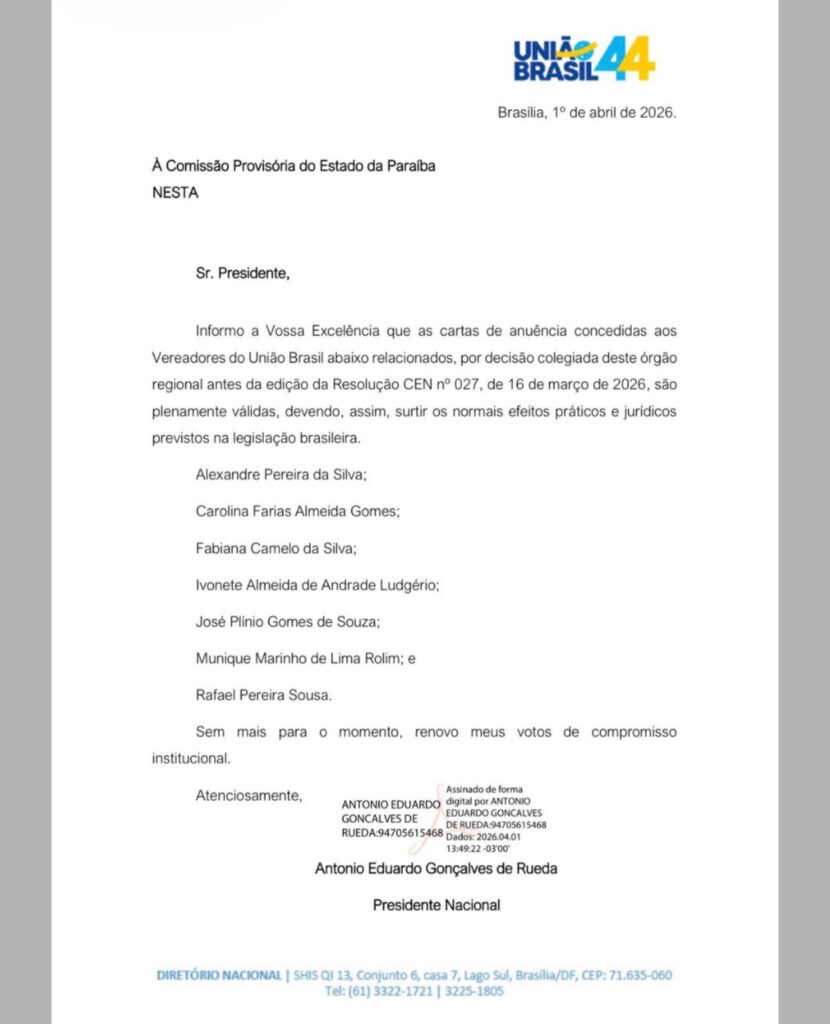 A tão falada carta de anuência da direção nacional do União Brasil para que vereadores de Campina Grande deixem a legenda e ingressem no PL finalmente chegou nas mãos dos parlamentares. O documento foi assinado pelo presidente nacional, Antônio Rueda.