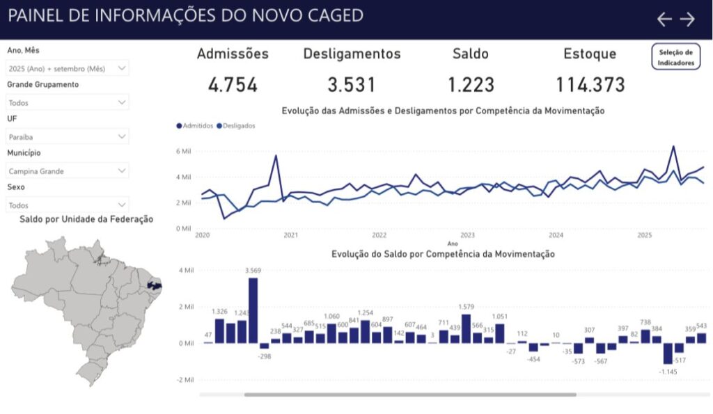 Foram, precisamente, 1.223 novos postos de trabalho gerados. O saldo positivo é resultado de 4.754 contratações ante 3.531 demissões. Com isso, Campina Grande supera, em nove meses, o quantitativo total de empregos gerados em 2024 (4.967), chegando ao nono mês de 2025 com o acumulado de 6.206.