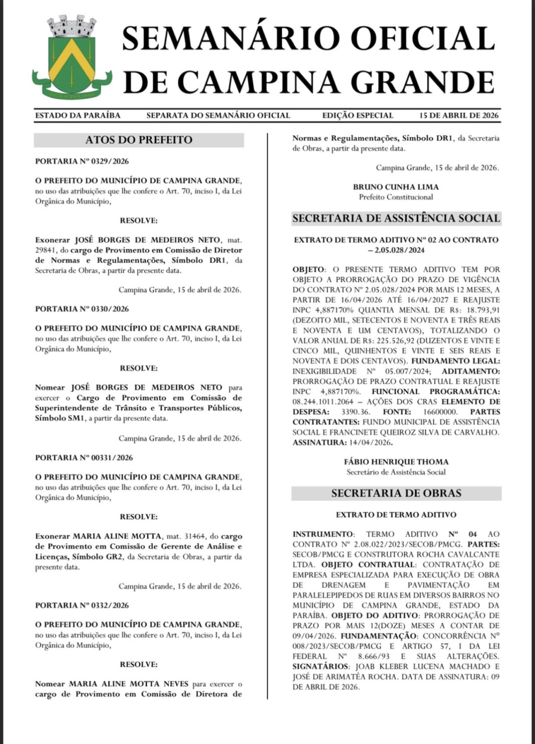 Uma separata do Semanário Oficial do município de Campina Grande publicada nesta quarta-feira (15) trouxe a nomeação de Neto Medeiros como novo superintendente da STTP.