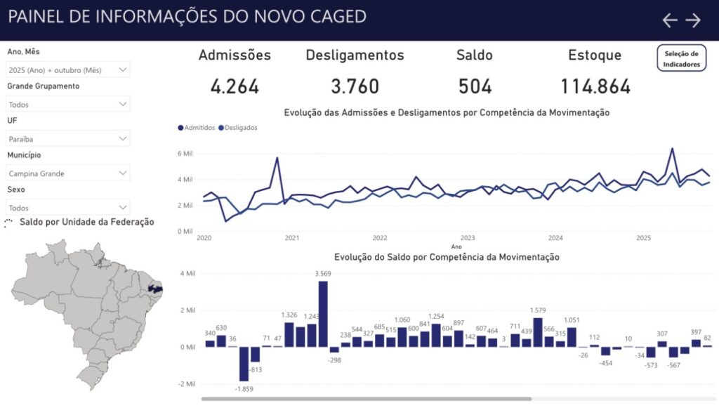 O número é resultado de 4.264 contratações ante 3.760 demissões. No acumulado de 2025, Campina chegou a marca de 6.695. A cidade possui também um número de 114.864 empregos formais atualmente.